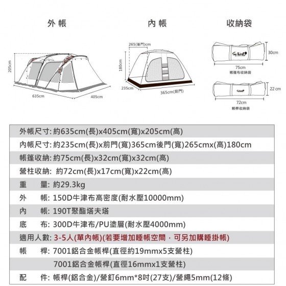 適用人數:3-5人(單內帳)(若要增加睡帳空間,可另加購睡掛帳)