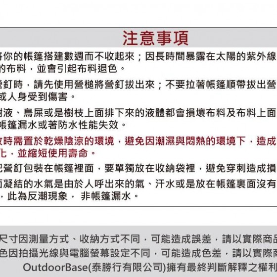 配 件:帳桿(鋁合金)/營釘6mm*8吋(27支)/營繩5mm(12條)