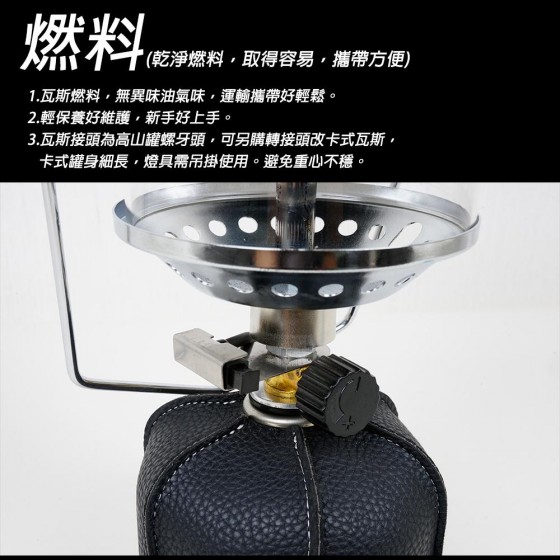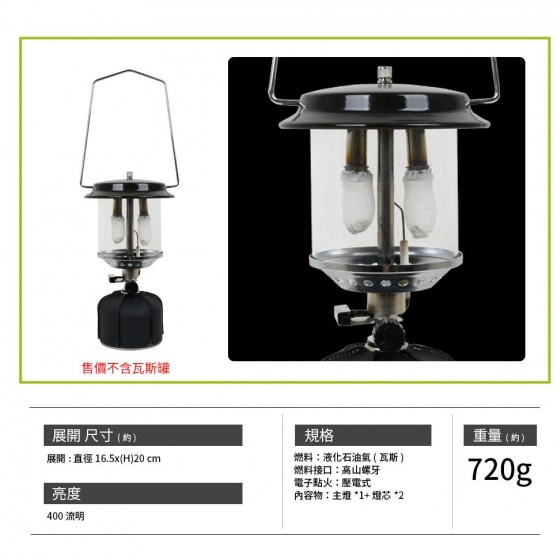 商品簡介: 1.400流明超高亮度 2.可拆卸金屬便攜提把。 3.電子點火裝置,使用好簡易。 4.每小時約95g瓦斯消耗量 商品型號:NTL37 商品名稱:嵐山雙燈芯瓦斯燈 商品尺寸:直徑16.5x20 cm 商品材質:鐵、銅、玻璃、耐衝擊塑膠 商品重量: 約720g 商品所需燃料 :高山瓦斯