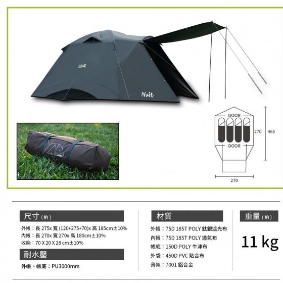 ※透明網布, 一目了然好找物 , 也增加透氣性。 ※整齊收納不散落 , 也可收納其他小物 。 ※束口設計 , 收納迅速有效率。 ※3mm厚, 通風、透氣、有彈性, 保護收納物品。 ※質量輕 , 不增加負擔。 商品型號NTG247BK 商品名稱努特NUIT 鈦銀膠火星人 270 家庭帳篷六人帳蓬 顏色# 尺寸(約)如圖所示 材質如圖所示