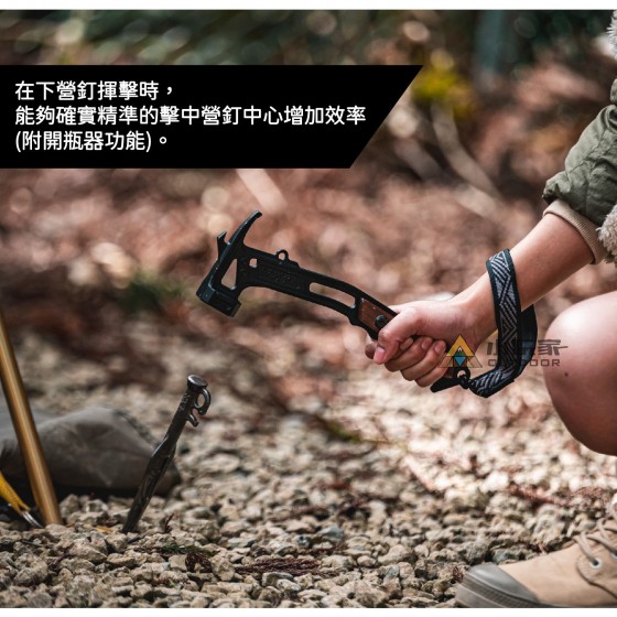 這款營鎚是輕營鎚,有別於團隊先前三款營鎚, 輕巧、迅速、好掌握, 在下營釘揮擊時,能夠確實精準的擊中營釘中心增加效率(附開瓶器功能)。