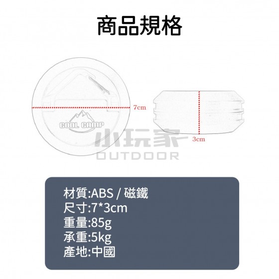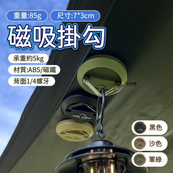 【商品規格】 品名 : cool camp 磁吸掛勾 尺寸:約7*3cm 顏色:黑色.軍綠.沙色 承重(約):約5kg 材質:ABS.磁鐵 重量(約):85g