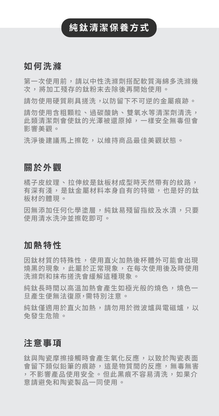 純鈦僅適用於直火加熱,請勿於微波爐與電磁爐使用。