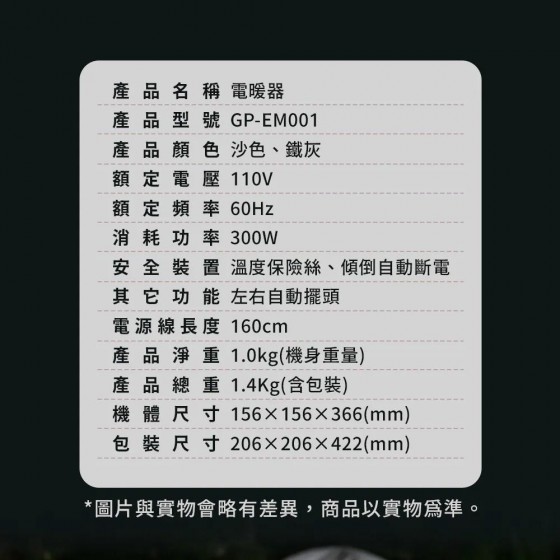 《超取每單限購一台》 《超取每單限購一台》 Gplus野營裡的無煙火爐 GP-EM001直立式電暖器 ※ 快速發熱 ※ 傾倒保護 ※ 左右擺頭 產品型號:GP-EM001 額定電壓:AC110V 消耗功率:300W 產品總重:1.4Kg(含包裝) 產品顏色:鐵灰、沙色 額定頻率:60Hz 產品淨重:1.0kg(機身重量) 機體尺寸:156X156X366(mm)