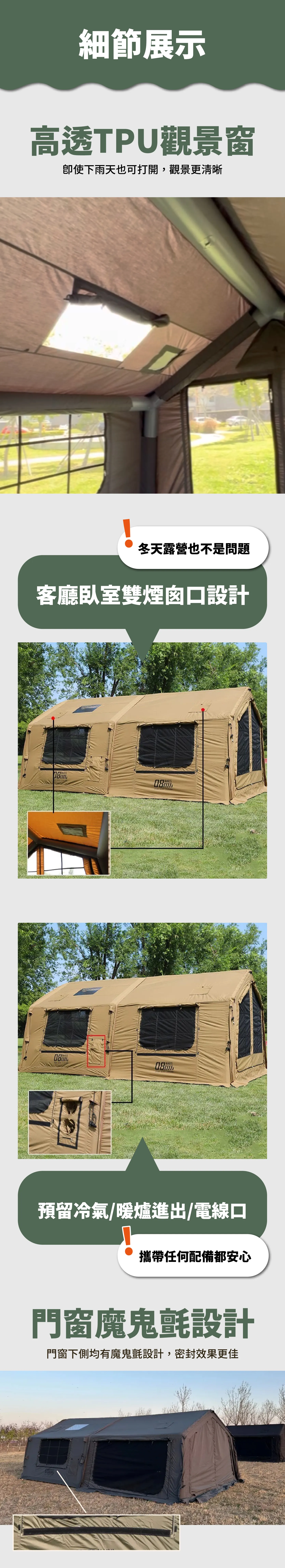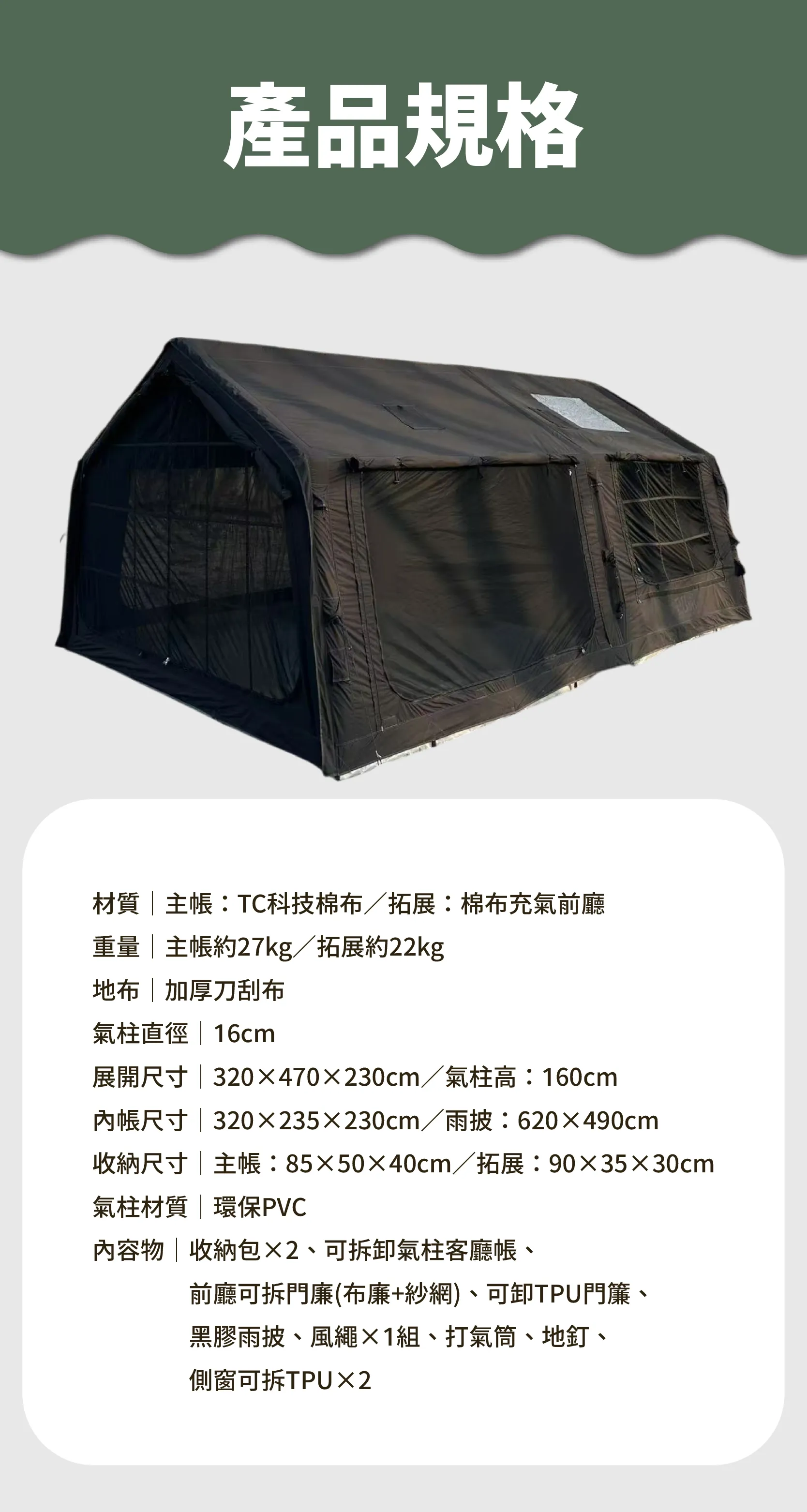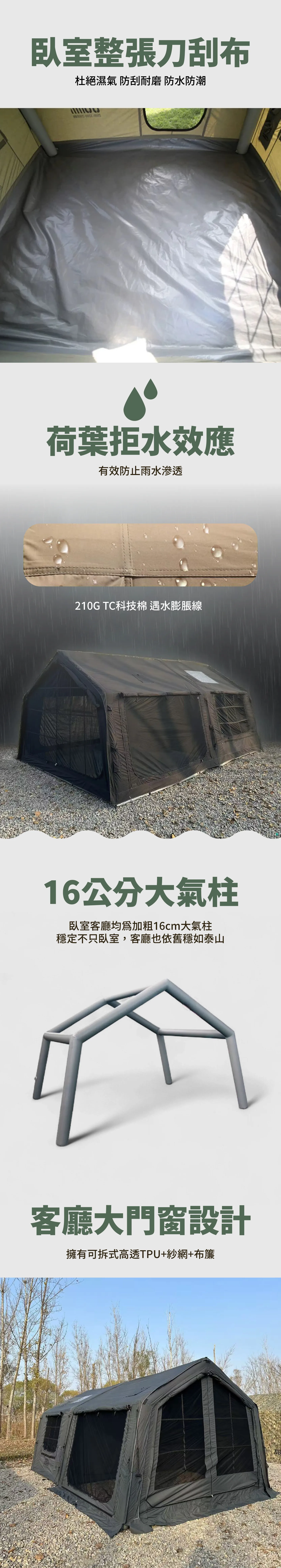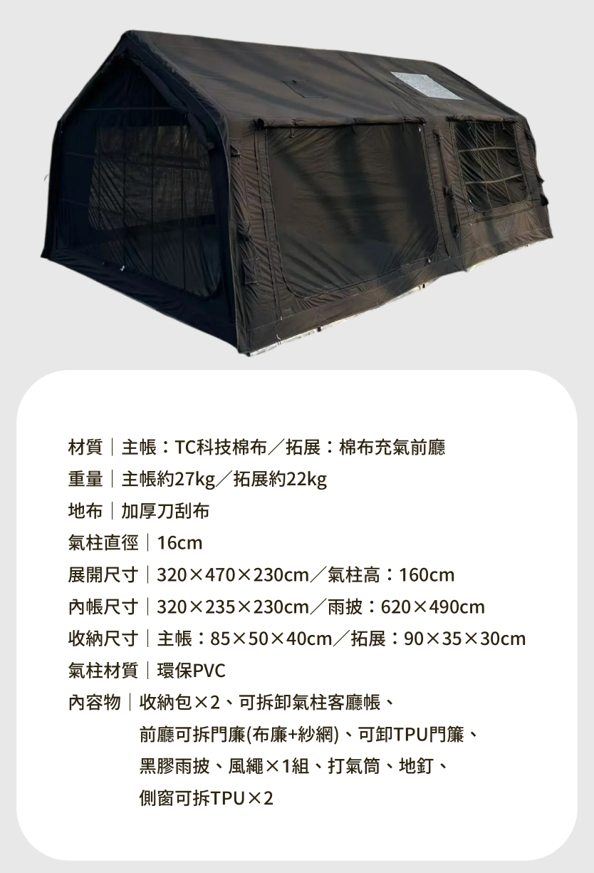 材質:主帳TC科技棉布/拓展棉布充氣前廳