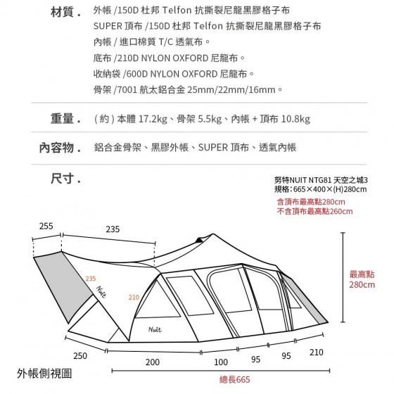 尺寸(約) : 665x400(H)280cm (含頂部最高點280cm , 不含頂布最高點260cm)