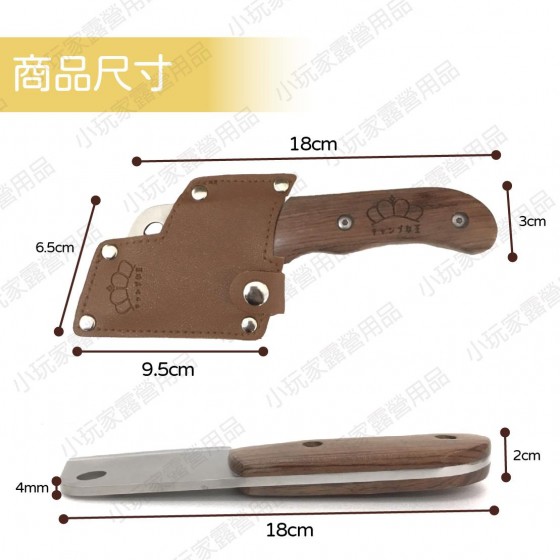 商品名稱 : 露營女王木柄料理刀 材質 : 不鏽鋼.木 尺寸 : 刀總長-18cm , 刀刃-9.5 , 刀寬6.5 , 刀厚度4mm 內容物 : 料理刀/收納皮套 重量 : 250g ------------------------------------------ 【商品特色】 ※堅固耐用的不鏽鋼刀 ※易攜帶體積質感厚實刀柄 ※方便吊掛的孔洞設計