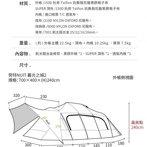 重量 :(約)外帳主體 22.5kg,頂布+內帳 10.25kg,骨架7.5kg