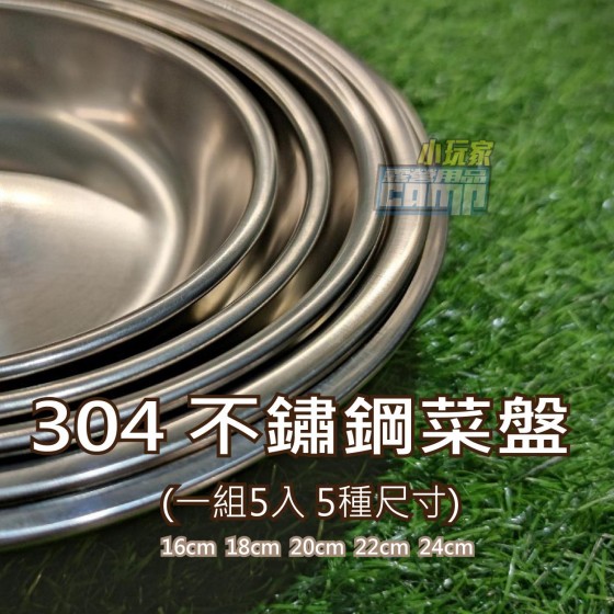 【小玩家露營用品】304不鏽鋼菜盤 露營分裝必備餐盤! 居家戶外都可以 方便收納不占空間 ============== 【產品介紹】 菜盤組(附網袋) 16 cm 304不鏽鋼餐盤*1 18 cm 304不鏽鋼餐盤*1 20 cm 304不鏽鋼餐盤*1 22 cm 304不鏽鋼餐盤*1 24 cm 304不鏽鋼餐盤*1 單入無網袋需另購