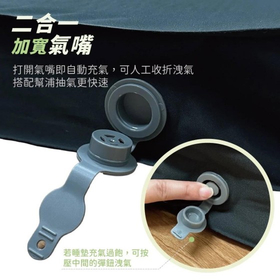 ◆ 2合1加寬快速氣嘴,快速吸氣澎起,可搭配電動幫浦快速抽乾空氣,睡墊吸扁扁的好折收,用人工收折也可以