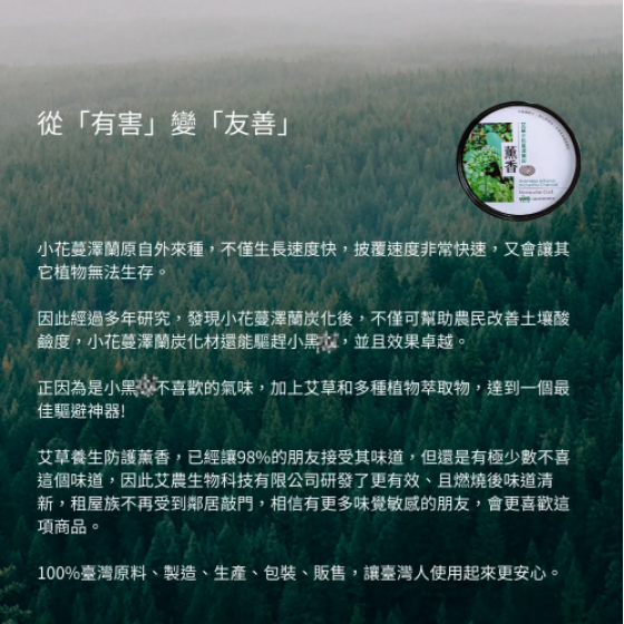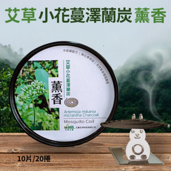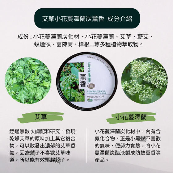 成 份 :艾草、小花蔓澤蘭炭化材、小花蔓澤蘭、竹粉、炭粉、蘄艾、蚊煙頭、茵陳蒿、 樟根等多種植物萃取物。
