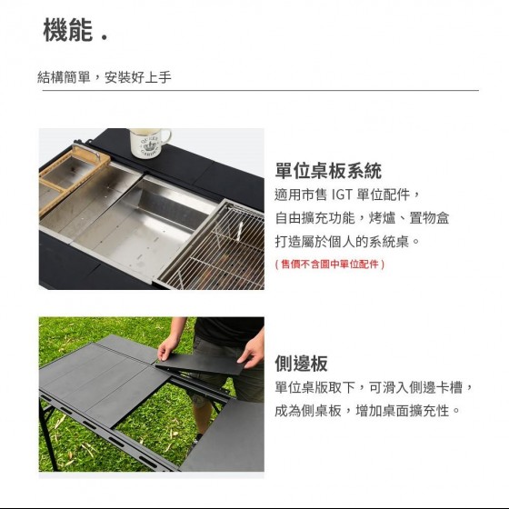※霧面黑磨沙鋁合金材質 ※適用IGT配件,可搭配市售一單位配件做使用 ※快速組裝,束狀收納,多種配件可選配 ※戶外露營居家都適合 ※附收納袋