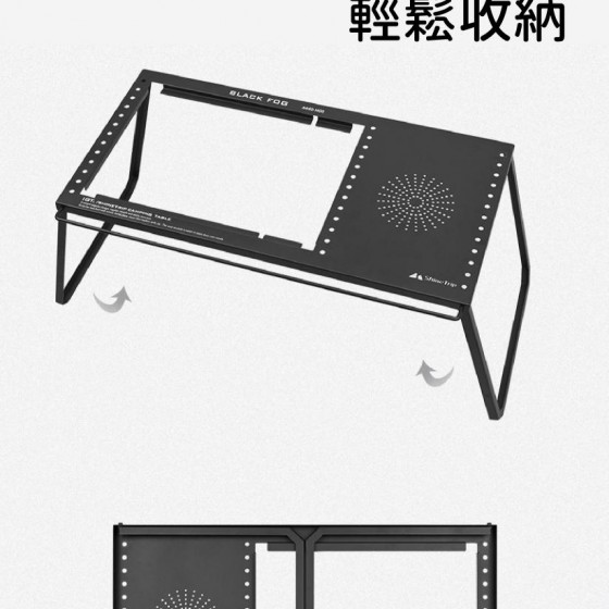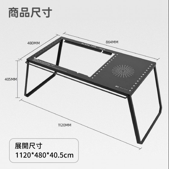 商品規格 品名:黑霧IGT露營桌 材質:碳鋼 重量:5kg 顏色:黑色 展開尺寸:1120*480*405mm