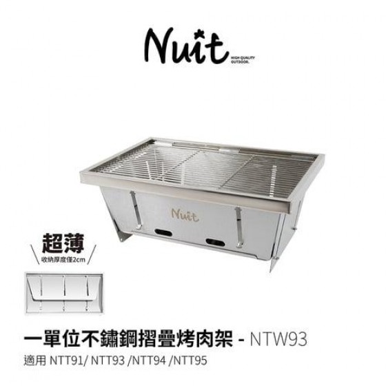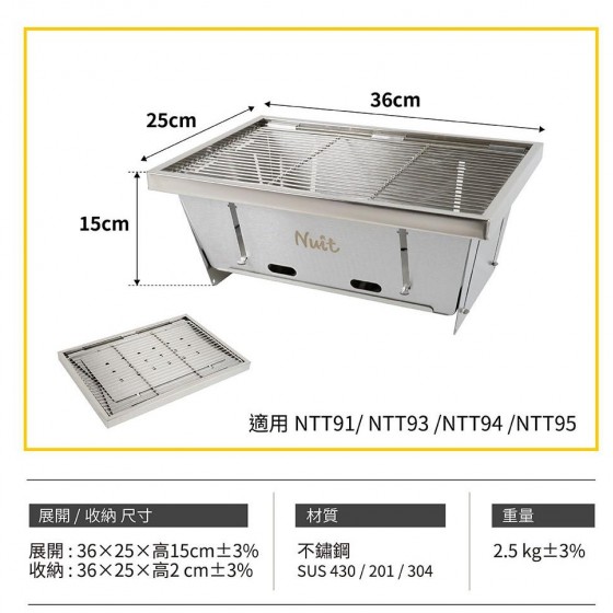 商品型號NTW93 商品名稱一單位不鏽鋼摺疊烤肉架 適用NTT91 NTT93 NTT94 NTT95 顏色# 尺寸(約): 展開(約):36*25*高15cm 收納(約):36*25*高2cm 材質:不銹鋼sus 430/201/304
