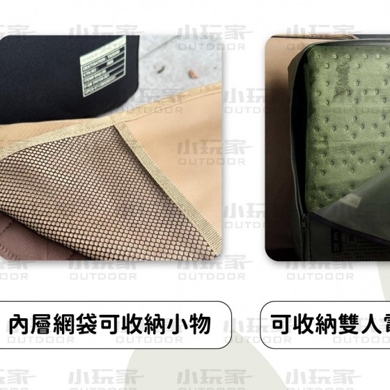 產品特點 100% 聚酯纖維材質 防潑水設計 內層網袋可收納小物 戶外風格配色 可收納雙人電毯、寢具 台灣製造品質有保障