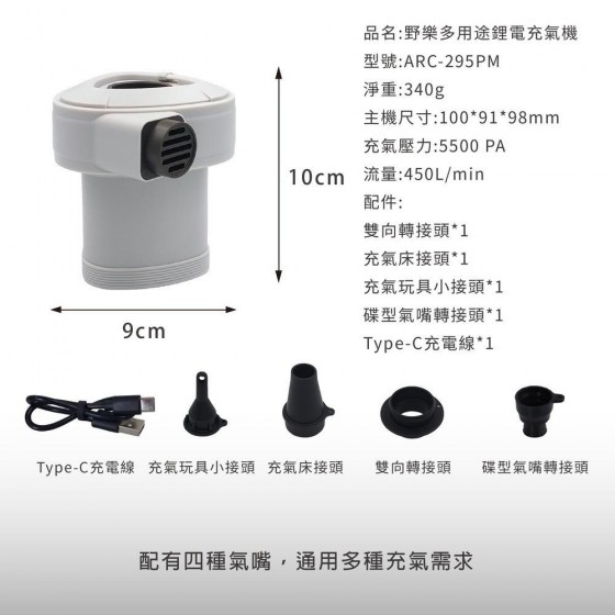 配件:雙向轉接頭*1、充氣床接頭*1、充氣玩具小接頭*1、碟型氣嘴轉接頭*1、Type-C充電線*1