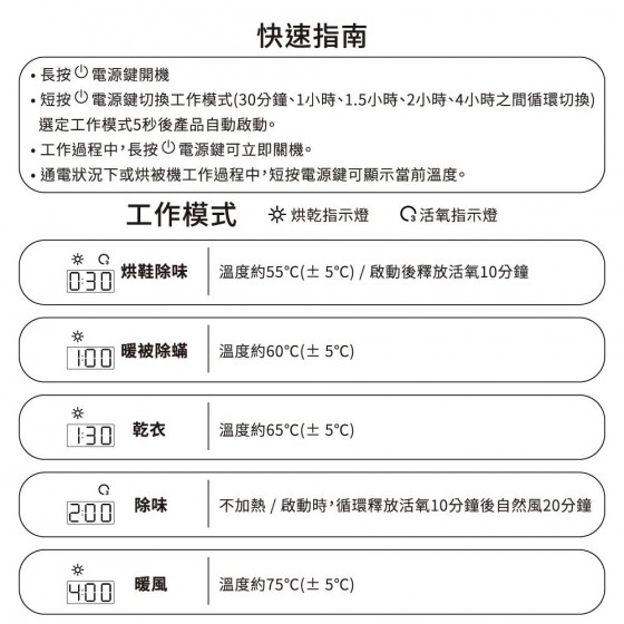 5段模式(烘鞋除味、暖被除蟎、乾衣、除味、暖風)