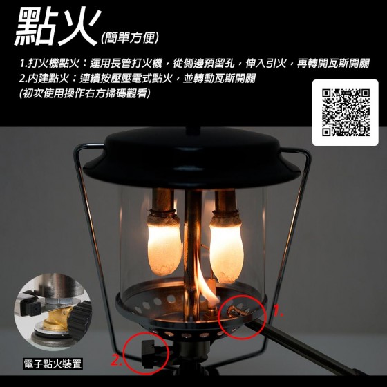 商品簡介: 1.400流明超高亮度 2.可拆卸金屬便攜提把。 3.電子點火裝置,使用好簡易。 4.每小時約95g瓦斯消耗量 商品型號:NTL37 商品名稱:嵐山雙燈芯瓦斯燈 商品尺寸:直徑16.5x20 cm 商品材質:鐵、銅、玻璃、耐衝擊塑膠 商品重量: 約720g 商品所需燃料 :高山瓦斯