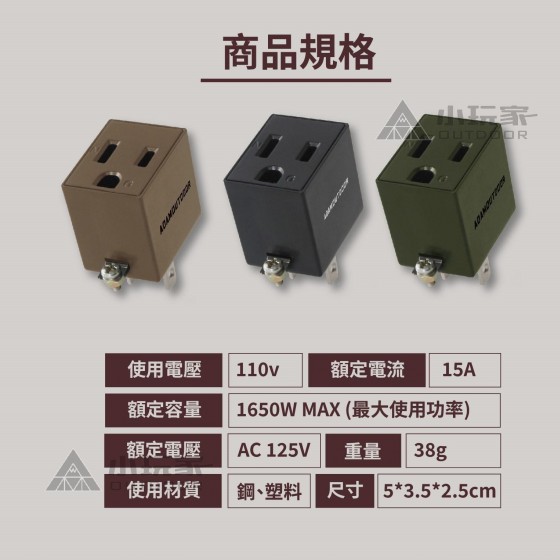 【商品規格】 使用電壓:110V 額定容量:1650W MAX(最大使用功率) 額定電壓:AC 125V 額定電流:15A 使用材質:鋼/塑料 尺寸:5*3.5*2.5 重量:38g