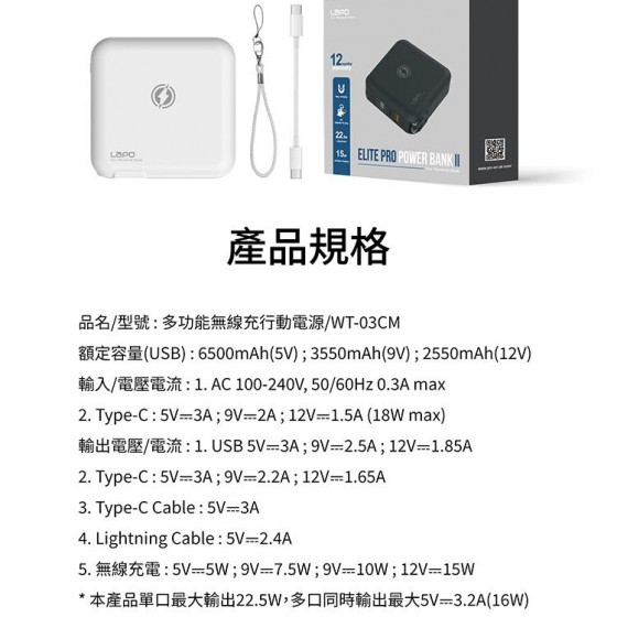 輸出電壓/電流:1.USB 5V=3A;9V=2.5A;12V=1.85A