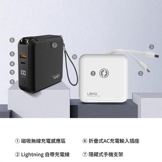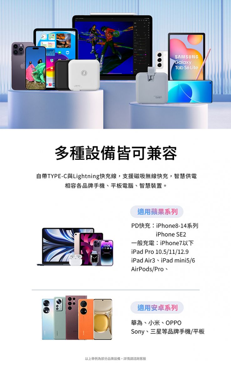 ・2種自帶線+雙口輸出+磁吸無線充電,最高支援五台設備同時充電