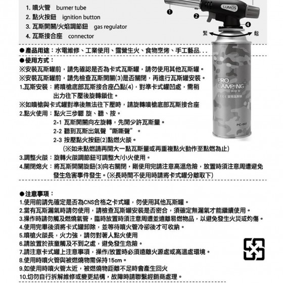 1.瓦斯安装:將噴槍底部瓦斯接合座凸點(4),對準卡式罐凹處,需稍 CAMPING