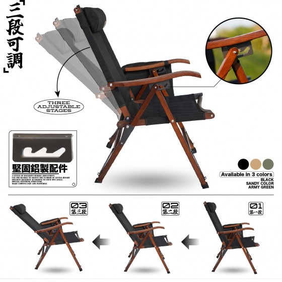 椅背三段角度調整 實木材質,質感滿分 頸枕可拆式設計,清洗更便利 椅背戰術織袋+網袋設計,吊掛收納更便利 附椅側置物袋,手機、行充隨手拿、隨手放 收納體積小,攜帶便利 名稱:實木高背可拆折疊椅 尺寸: 展開尺寸:55*53.5*(h)88/84/76 cm 收納尺寸:85*23*16.5 cm 外箱尺寸:86*23*17 cm 靜態承重:約120 kg 材質:櫸木、1000D牛津布 淨重:5.1 kg 顏色:黑色/沙色/軍綠