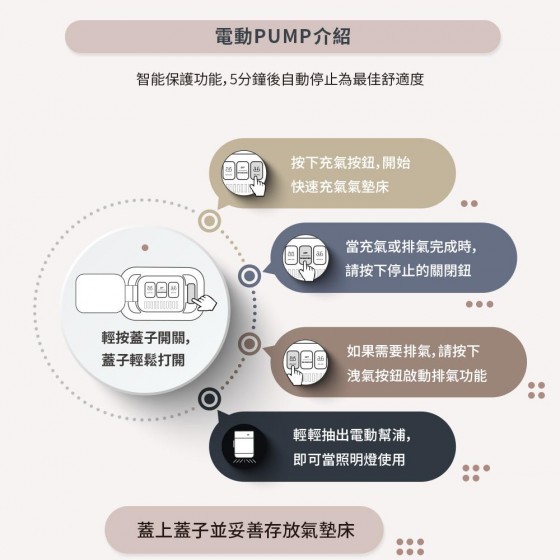 3、電動幫浦充電時間:3小時、充電電壓:5V-1A。
