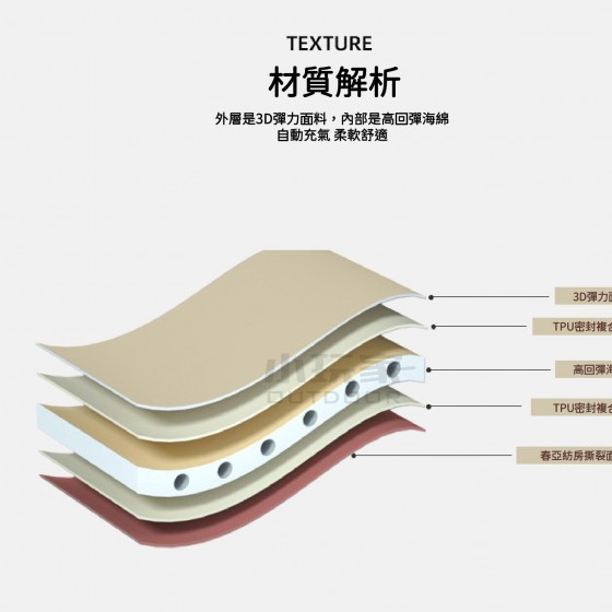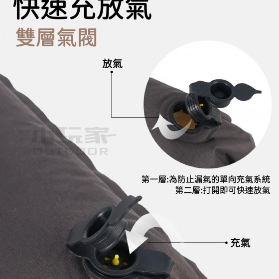 柔軟舒適的高彈海綿,防撕裂春亞紡面料 外層是3D彈力面料,內部是高回彈海綿 貼合頸部曲線,不易落枕 自動充氣設計,雙層氣閥 第一層:為防止漏氣的單向充氣系統 第二層:打開即可快速放氣 體積小,方便攜帶