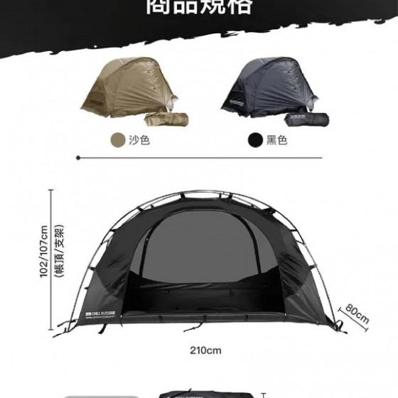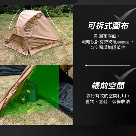 內含:內帳x1、支架x1、外頂帳x1、可拆式圍布x2、營釘及營繩