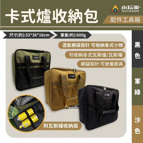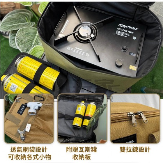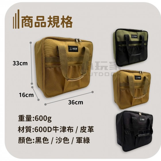 卡式爐收納包,一包搞定 輕鬆帶著走 各式爐或餐廚具都能放,安全不碰撞 - 外觀多樣化收納 織帶、透氣網袋設計 可收納各式小物 雙拉鍊設計 方便拿去 皮革提把 舒適好拿 大容量收納 可收納各式瓦斯爐/瓦斯罐 上蓋網袋設計 可放多樣餐廚具 附贈瓦斯罐收納板 收納不碰撞且安全 - 商品規格 顏色:黑色、卡其色、軍綠 材質:600D牛津布、皮革 尺寸:36×16×33cm 重量:600g