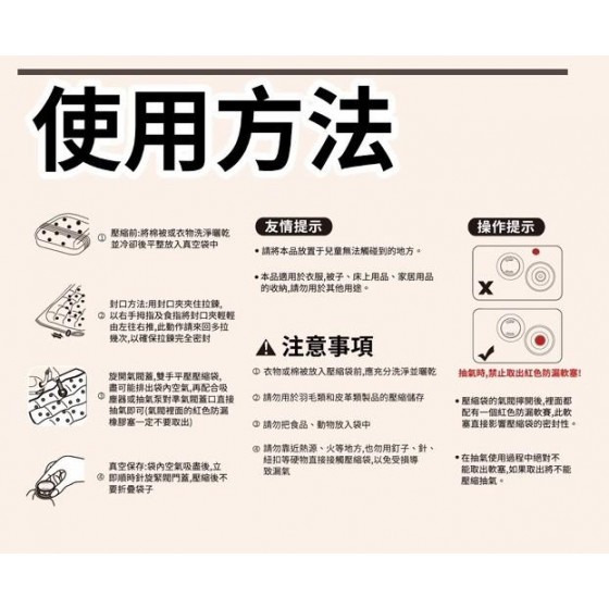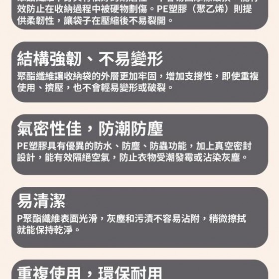 👉耐磨抗刮 聚酯纖維,有效防止在收納過程被硬物劃傷。 PE塑膠,高強度柔韌性,不易裂開。 👉氣密性佳,防潮防塵 具有優異的防水、防塵、防蟲,加上真空密封設計,能有效隔絕空氣,防止受潮發霉 👉重複使用,環保耐用