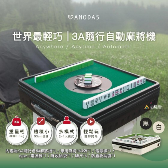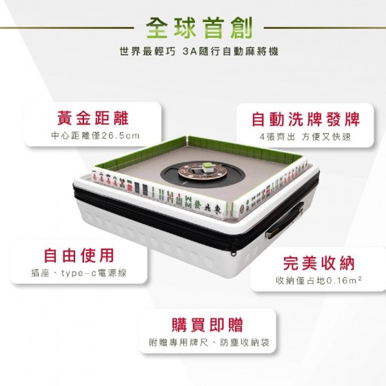 「3A隨行自動麻將機」是一款可以隨時隨地輕鬆攜帶、維持像在家一樣的麻將體驗、真實手感,而且又方便收納的隨行自動麻將機。