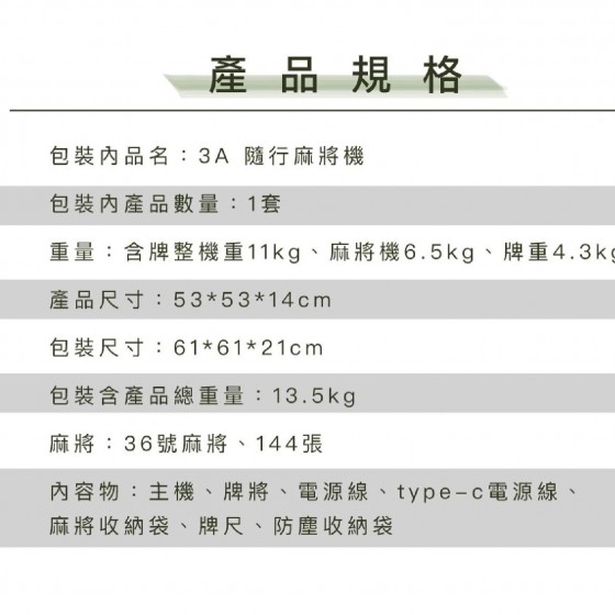 ● 內容物:3A 隨行自動麻將機 x1、專用麻將 144張 x1、電源線 x1、type-c 電源線 x、 麻將收納袋 x1、專用牌尺 x4、防塵收納袋 x1