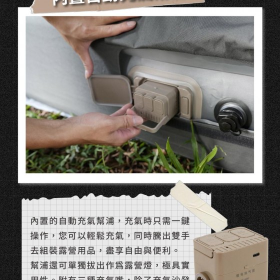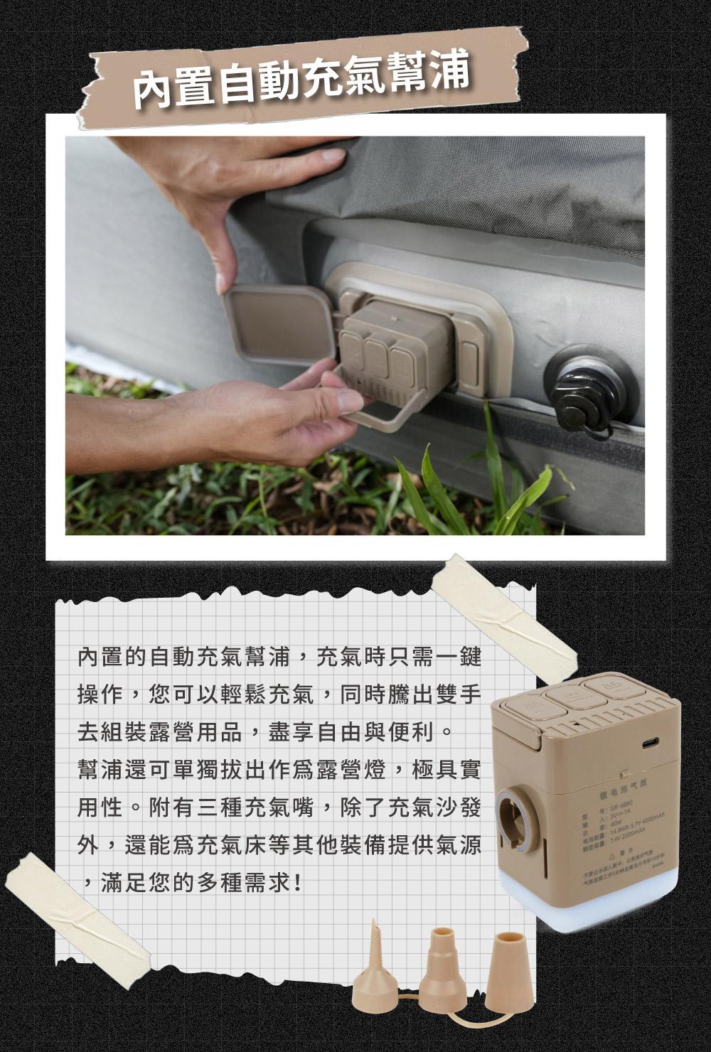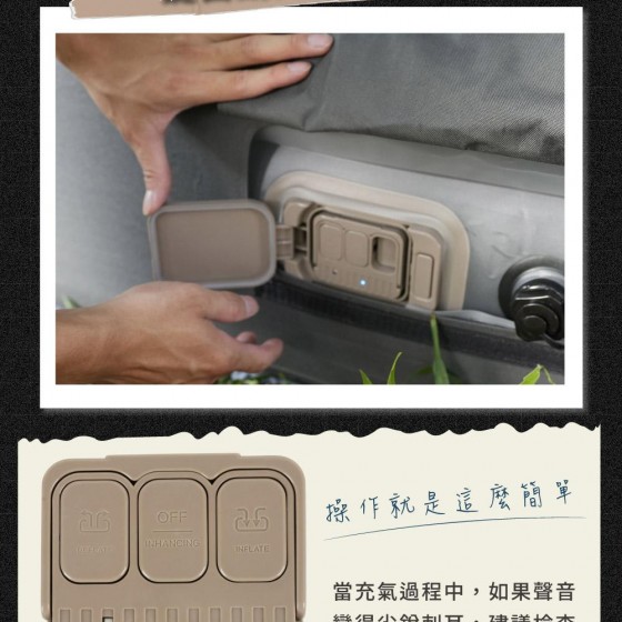 ※內置電動幫浦,一鍵自動充氣即使無電力營區,也能輕鬆打氣!