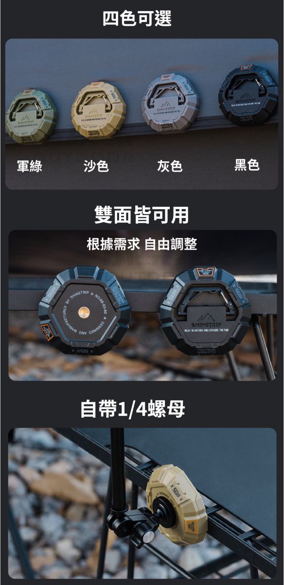 ✨掛鉤鎖止功能設計 ✨自帶1/4螺母 ✨戰術風格設計四色可選 ✨雙面可用,隔層磁吸 ✨強磁吸附安裝方便,n35等級鍍鋅磁鐵 ✨強磁懸掛承重力強,可懸掛露營燈等物品