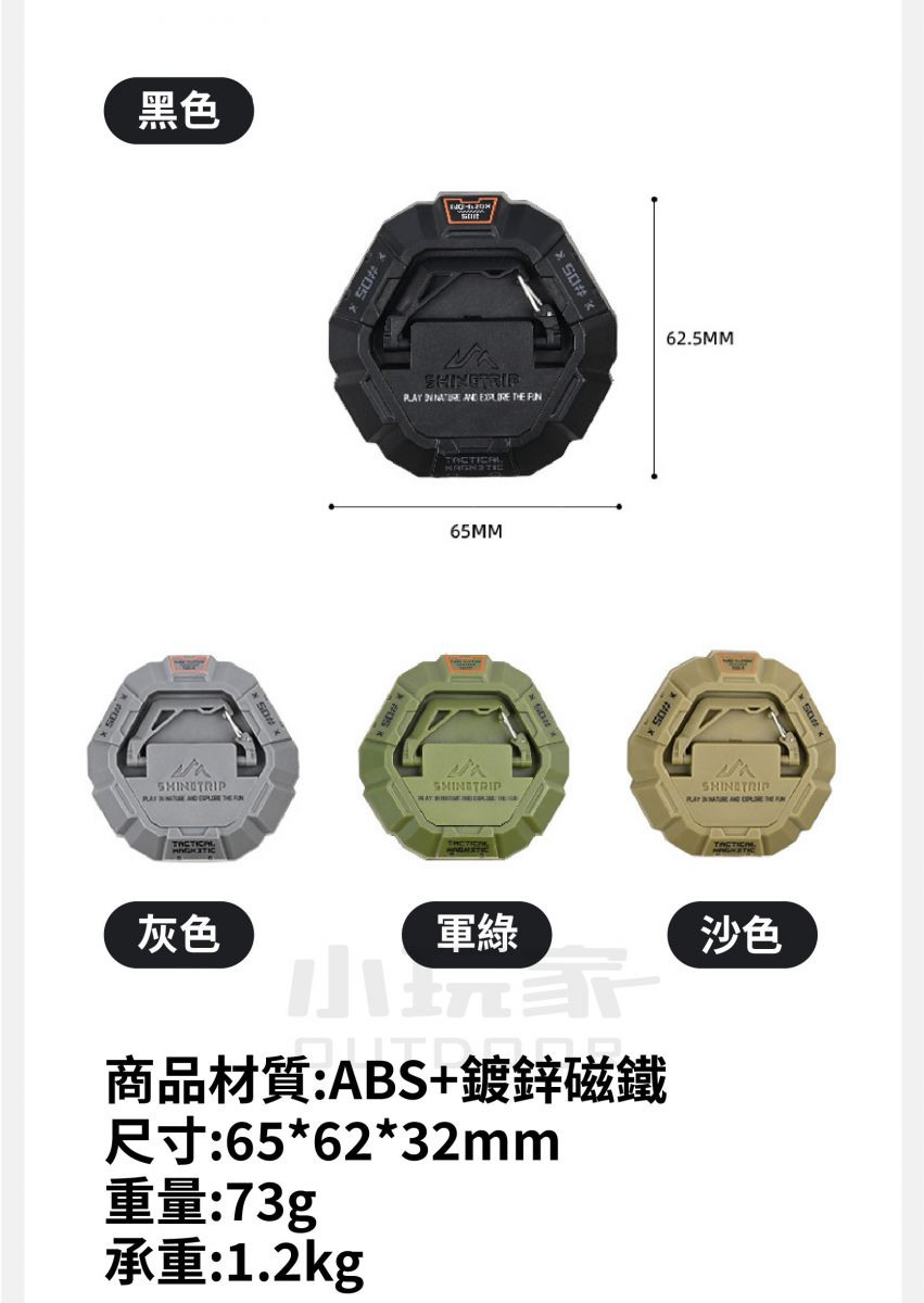 [規格] 顏色:黑色/軍綠/沙色/灰色 材質:ABS+鍍鋅磁鐵 尺寸:66x62x32mm 重量:73g 承重:1.2Kg