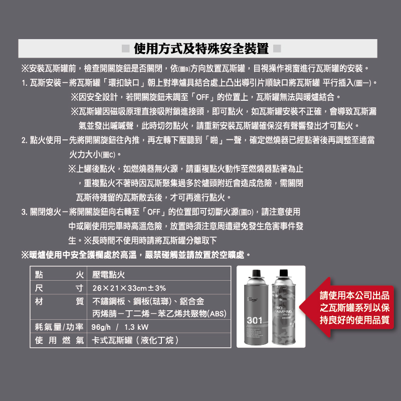 ●使用燃氣:卡式瓦斯罐(液化丁烷)