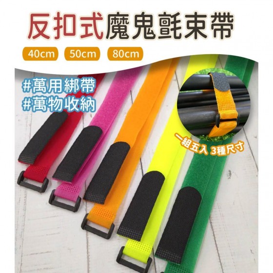 商品名稱 : 反扣式魔鬼氈束帶(彩色5入50/80cm) / (黑色4入50/80cm) 尺寸 : 50X2(寬) / 80X2.5(寬) 內容物 : 彩色5入 (顏色隨機出貨) 黑色4入 --------------------------------------------------------------------------- 適用 : 固定物品綑綁物品