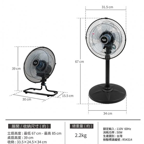 尺寸(約) : 立扇高度 - 最低67 cm (最高85 cm)