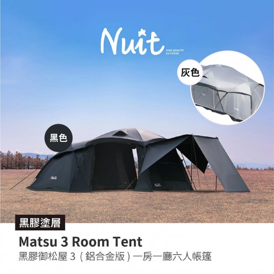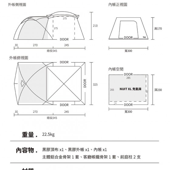 商品名稱努特NUIT 鋁合金黑膠御松屋一房一廳六人帳蓬 顏色黑 尺寸(約)外帳:210x545x325 cm