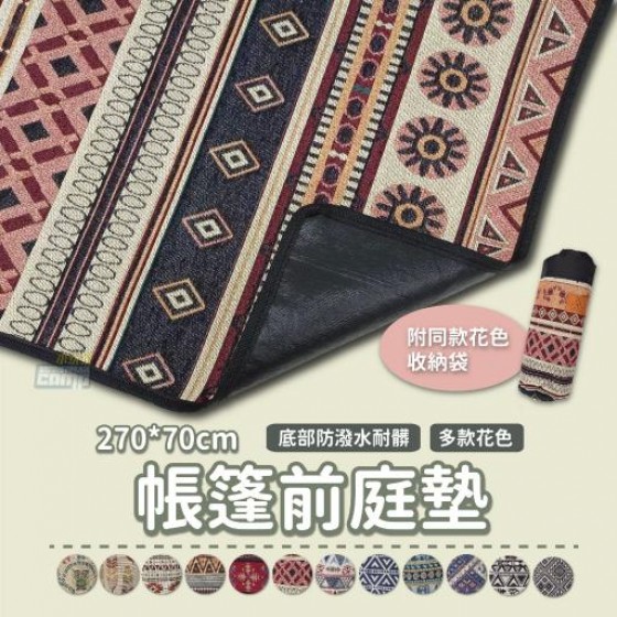商品名稱 : 前庭地墊 材質 : 棉麻牛津布 展開尺寸 : 270x70cm 收納尺寸 : 27x27cm 重量 : 約1.1kg ----------------------------------- ※可防止鞋上砂石帶入帳篷 ※底部防潑水耐髒,表面花布多樣 ※附收納袋