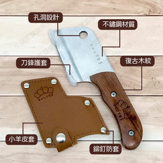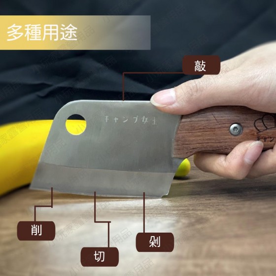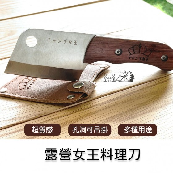 商品名稱 : 露營女王木柄料理刀 材質 : 不鏽鋼.木 尺寸 : 刀總長-18cm , 刀刃-9.5 , 刀寬6.5 , 刀厚度4mm 內容物 : 料理刀/收納皮套 重量 : 250g ------------------------------------------ 【商品特色】 ※堅固耐用的不鏽鋼刀 ※易攜帶體積質感厚實刀柄 ※方便吊掛的孔洞設計