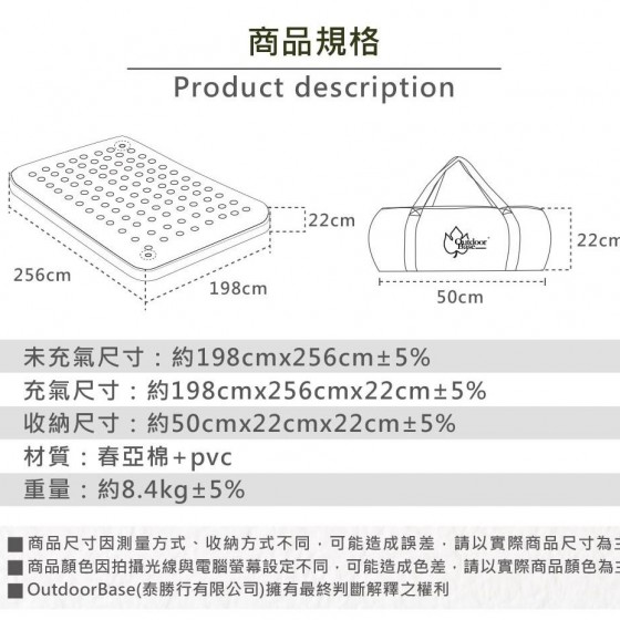 充氣尺寸 : 約198cmx256cmx22cm±5℅