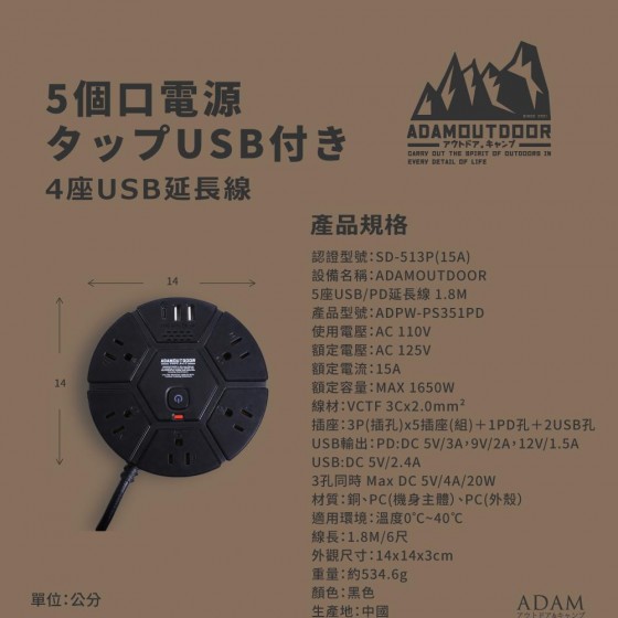 商品名稱 : ADAM 5座USB/PD延長線 1.8M