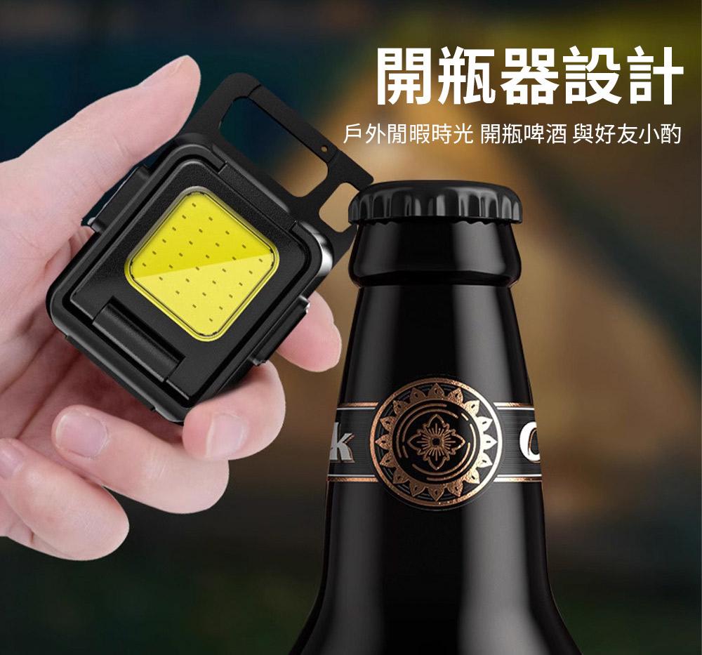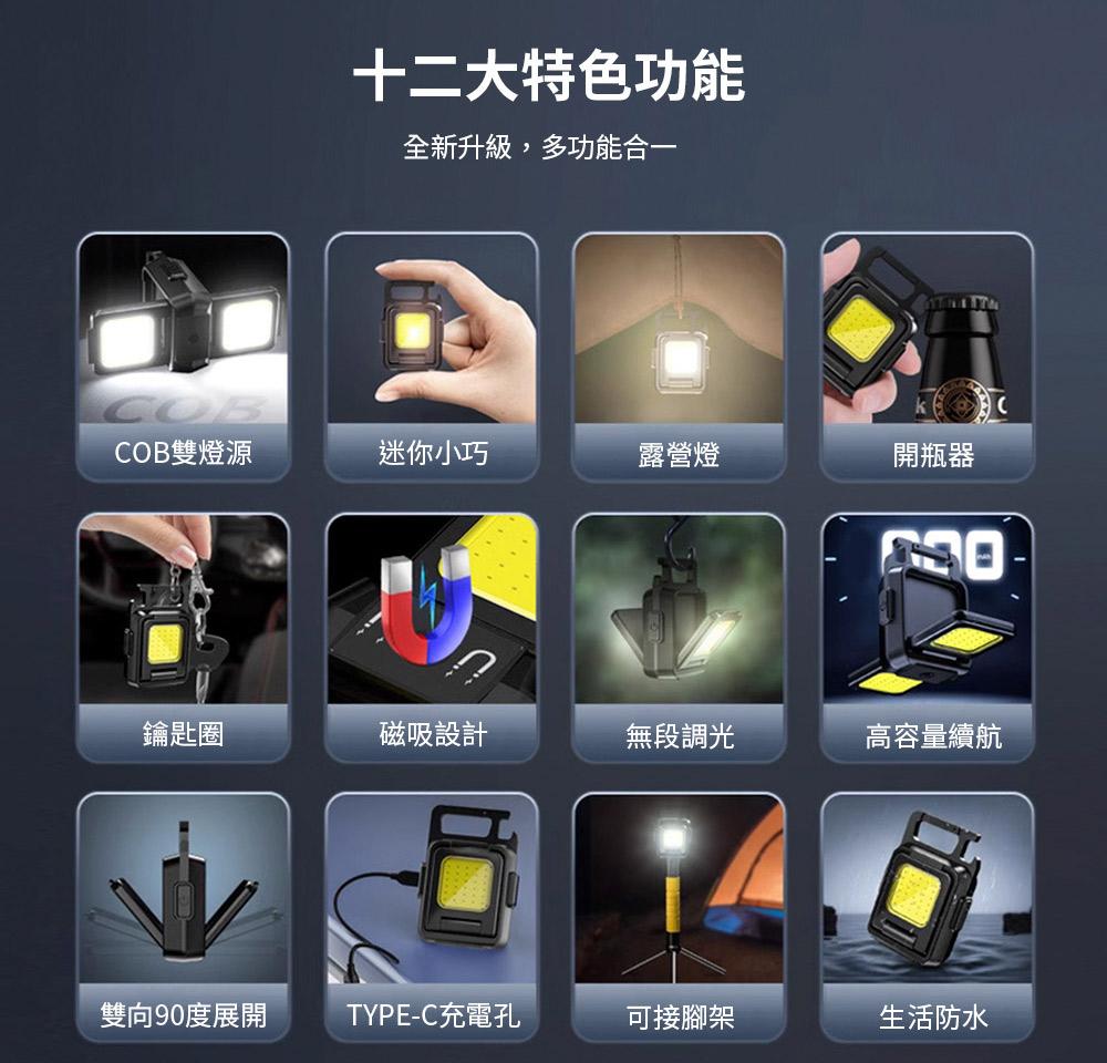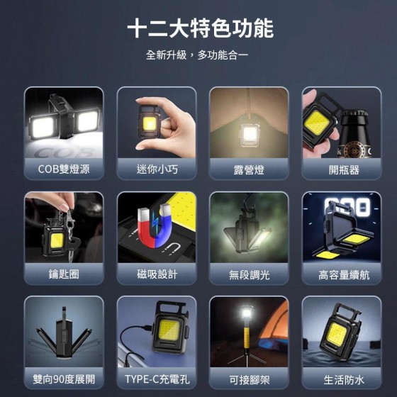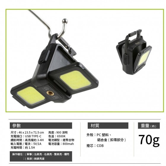 ※COB雙光源照明板燈 ※一鍵開關/切換模式/長按調節亮度(低亮轉高亮) ※最大亮度900流明 ※可作開瓶器 ※可掛於書包、鑰匙圈、腰帶 ※Type-C充電