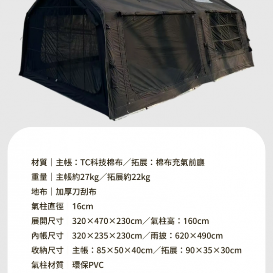 材質:主帳TC科技棉布/拓展棉布充氣前廳